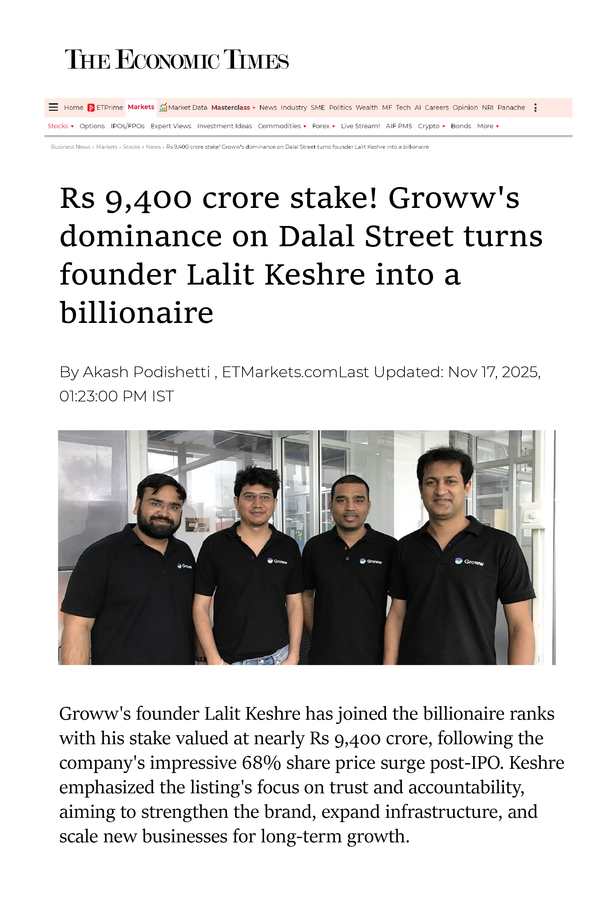 Groww is Indias leading investment platform, making trading and wealth creation simple and transparent. With its intuitive interface, fast onboarding, and access to stocks, mutual funds, and IPOs, Groww empowers investors to make confident financial decisions.